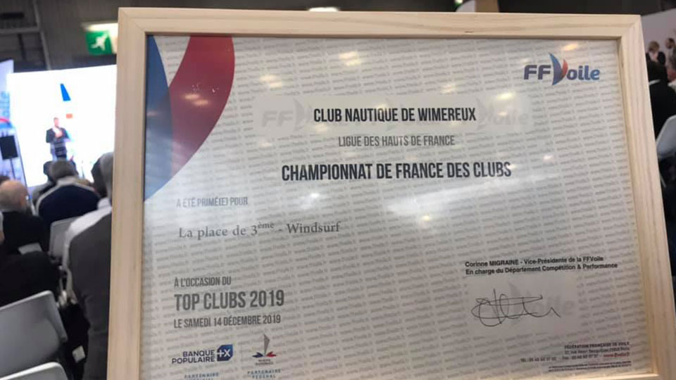 A l’occasion de la cérémonie des Top Clubs 2019 sur la Scène du Salon Nautique de Paris, Le Club Nautique de Wimereux a été récompensé par la Fédération Française de Voile pour sa 3ème place au niveau national en windsurf.